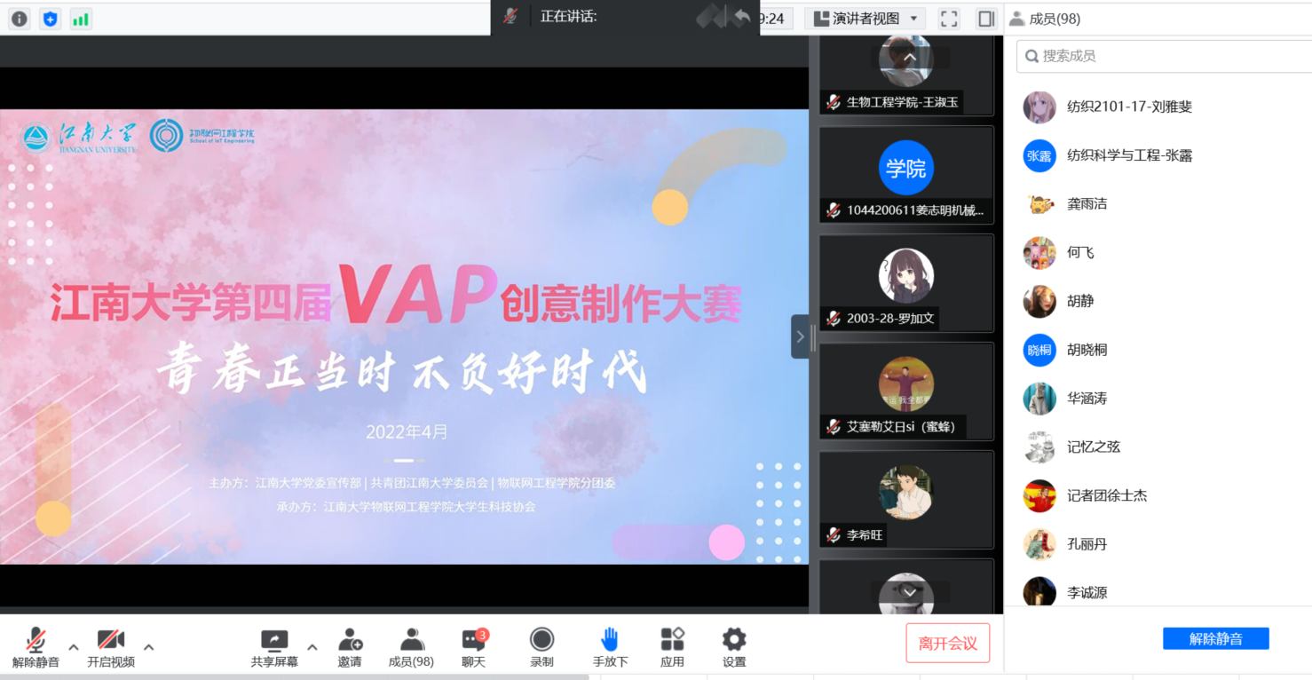 、外国语学院、人文学、化学与材料工程学院、人工智能与计算机学院等10余个学院30与支队伍的广泛参与。经过前期报名、资格审查、培训指导、初赛评审等环节,共评选出6个PPT作品、6个视频作品进入最后的决赛环节。这些决赛作品描述的对象涵盖当代逆向而行的抗疫青年、领导青年运动的英雄人物、莫负胸中凌云志的青年大学生,作品无一不体现了江南学子对新时代青年人奋斗经历的敬意和希望。通过激烈角逐,最终《致敬,最可爱的人》《梦马时代》两项作品分别获评视频组和PPT组一等奖。