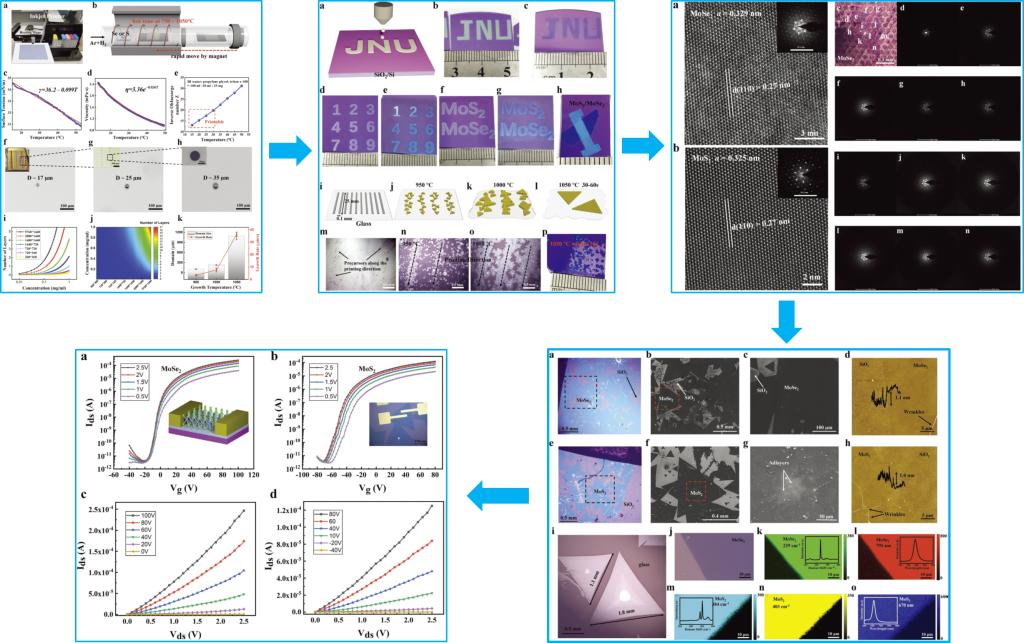 科研团队首先通过调控含有TMDCs前驱体(钼酸铵与钨酸铵)水溶液的流变学参数,包括其表面张力与粘度系数等,研制出水基前驱体墨水,然后利用低成本﹑商业化的喷墨打印机,系统的研究与优化了喷墨打印参数,包括:液滴尺寸﹑打印DPI﹑墨水浓度﹑打印图案等,在SiO2/Si,钠钙玻璃等衬底上实现了对前驱体在微微克(万亿分之一克)量级的超精确﹑图案化打印,最后,通过自行研发超快速化学气相沉积(CVD)过程,在SiO2/Si衬底上制备出了厘米级﹑图案化的TMDCs薄膜,并可在30秒内于钠钙玻璃衬底上制备出毫米级的单晶TMDCs (生长速率可达36.4 µm/s)。该TMDCs薄膜表现出了优异的电学特性,MoS2与MoSe2场效应晶体管的载流子迁移率分别达到了21与54 cm2V−1s−1,器件开关比达107,Ioff截止电流为10-12A,有望实现基于TMDCs的低功耗柔性器件与集成电路应用。