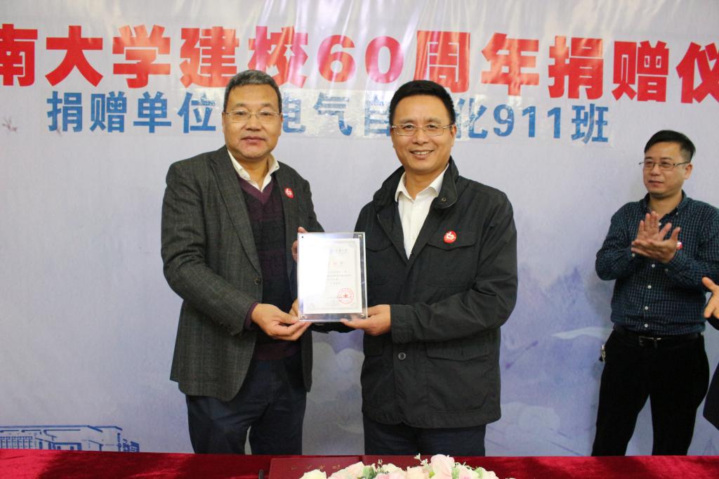 党委书记程捷音接受捐赠,纪志成颁发捐赠证书。此次电气自动化911班向中文无码