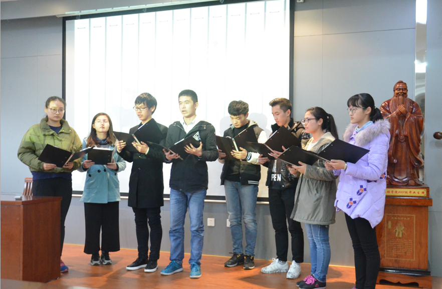 在“悟道德”环节里,程勉中老师以“国学与社会主义核心价值观”为题,给大家带来了一场精彩的讲座。程老师首先向大家解读了国学的基本内涵,其次,他指出,国学的传统文化精华是涵养社会主义价值观的源泉,即“自强不息、以和为贵”等思想是“富强、民主、文明、和谐”这一国家层面价值目标的源泉,“仁爱、中正、天下为公”等思想是“自由、平等、公正、法治”这一社会层面价值目标的源泉,“忠、义、诚、信、礼”等思想是“爱国、敬业、诚信、友善”这一公民层面价值目标的源泉,从国学到社会主义核心价值观,不同层次不同内容的“道德遵循”是主要价值追求之一。最后,他希望同学们在身心的维度追求“道以养生”,在情感的维度追求“诗以抒情”,在道德的维度追求“儒以涵德”,在智慧的维度追求“慧以净心”,以校训“笃学尚行、止于至善”为引领,培养好德性,坚守好德行,做社会主义核心价值观的践行者。接着,在场所有同学在主持人带领下,在文明礼貌,爱护环境,诚实守信,乐于助人,文明上网,遵守校纪,律己修身等方面,提出“建文明校园,做文明学生”的倡议,并在倡议书上签字,以响应建设文明校园的号召。