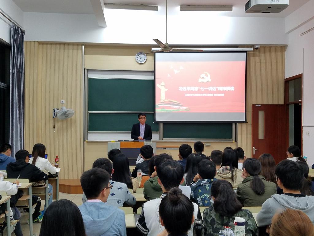 开班仪式结束后,唐忠宝老师进行了以习近平同志“七一”重要讲话精神解读为主题的讲座。唐老师以“不忘初心”引入点,引经据典、旁征博引,以当下热议的话题为佐证全面透彻地讲述了有关“马克思主义、共产主义、四个自信、全面建成小康社会、全面深化改革、以人为本、和平发展、全面从严治党”的八个“不忘初心”。他着重强调了“信仰”,认为“信仰就是人生存下来的意义,共产主义就是这样一种信仰”。讲座现场因唐老师的诙谐幽默、妙语连珠而笑声不断,最后讲座在同学们热烈的掌声中落下帷幕。