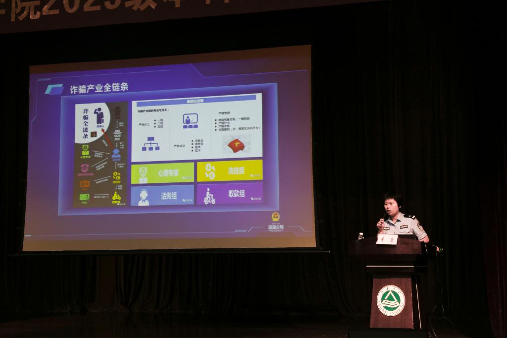 反诈宣传板块,学院特邀雪浪派出所警官现身说法。董蕾警官以“防范电信网络诈骗”为题,从介绍电信网络诈骗的定义、电信网络诈骗的基本特征入手,分享学生电信网络诈骗的典型案例,以学生受骗常见方式教育引导学生规范网络行为,正确识别诈骗手段,提醒学生在互联网的虚拟世界里,要做到个人信息不透露、未知链接不点击、陌生来电不轻信、转账汇款多核实等。
