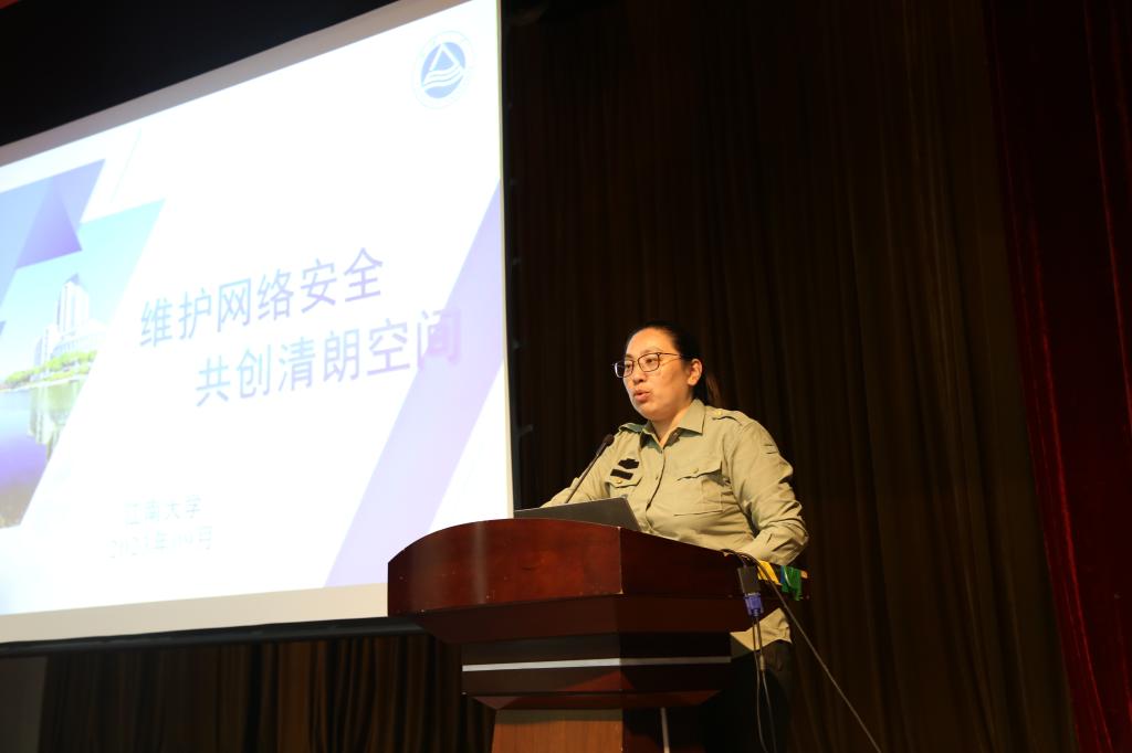 孔丽丹首先对2023级新同学表达了热烈的欢迎和祝贺,并作“维护网络安全,共创晴朗空间”主题讲座。她从网络安全相关法律法规入手,告诫学生互联网不是法外之地、互联网不是虚拟空间;以真实案例为警示,强调维护校园网络安全和网络文明的重要性;以中文无码