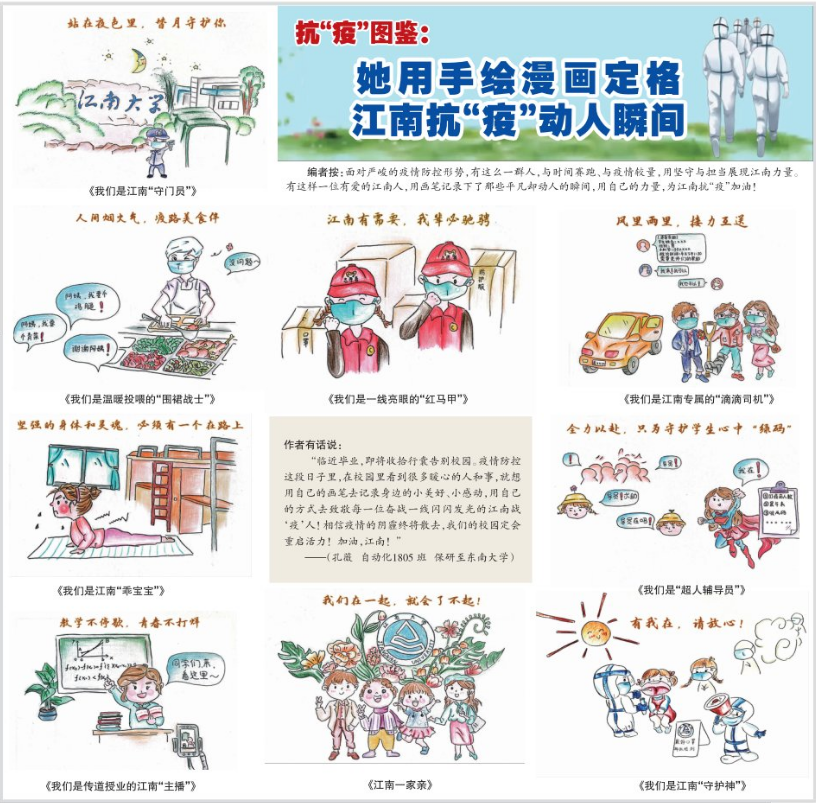 为引导学生在劳动中发现美、感悟美和创造美,学院先后举办“‘声’动百年,‘音’为有你”作品征集大赛、“VAP”创意制作大赛、征文大赛、摄影大赛等,引导广大学生积极创作优秀文化作品,尤其是网络文化作品,活跃校园网络空间生态,传递劳动最美正能量。微视频《顶峰相见》记录江南追梦人的奋斗之旅,既是对学子乐学苦思、踔厉奋发群像的整体展示,也是为激励更多的青年用奋斗擦亮青春底色,用行动磨砺青年意志!自动化1805班孔薇用9幅原创手绘漫画定格校园疫情防控中的动人瞬间,画中的主人公有党员教师志愿者、学生志愿者、辅导员、保安、配餐人员等,无不可爱又有暖心,她用手中画笔发现劳动之美,为江南战疫加油。画作及其背后的故事先后被江苏教育发布、新华报业网、紫牛新闻、江南晚报转载报道。