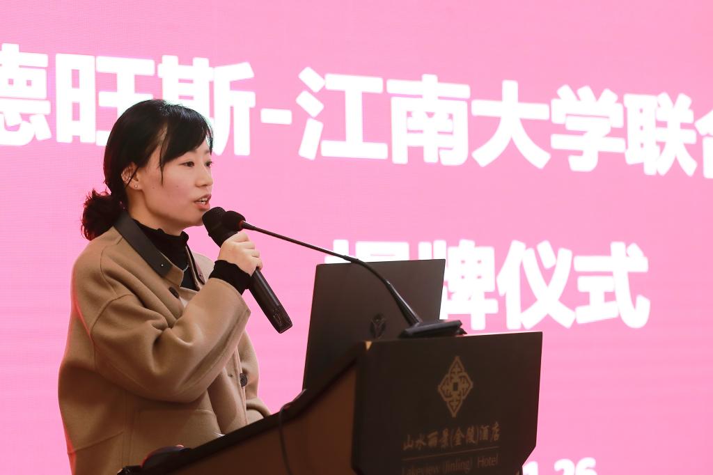 致辞,他表示,学校将继续以服务国计民生为己任,紧密对接国家战略需求和地方经济社会发展需要,积极参与国家和区域创新体系建设,大力推进科技服务、协同创新与科研成果转化,开创江南特色产学研协同发展之路。他希望联合实验室本着“优势互补、双向参与、共同发展”的宗旨,针对重点领域加强合作,努力实现科学研究、产业应用和人才培养的互惠共赢。