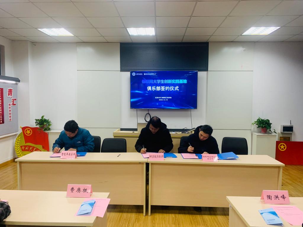 签约仪式上,费赓柢简要介绍了物联网大学生创新实践基地的基本情况,强调了基地实验室安全及管理制度。俱乐部责任指导老师分别签订《物联网大学生创新实践基地俱乐部设立协议书》,陶洪峰副院长向各俱乐部责任指导老师颁发了聘书,并与俱乐部负责老师进行交流。他向各俱乐部提出了三点希望,一是希望通过俱乐部积极进行创新实践教学体系的探索与实践,使学生的学习从“被动学习”、“独立学习”转变为“主动学习”、“创新学习”和“合作学习”;二是希望通过俱乐部进一步提升我院学科竞赛的水平,让学科竞赛引领学生成长。三是希望积极开展丰富多彩的科创活动,通过举办学术沙龙、科普讲座等活动,营造良好的创新创业氛围。