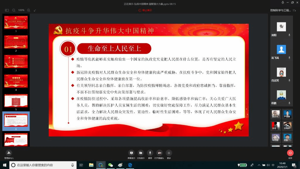 控制科学与工程博士第二党支部书记刘相在企业微信上向支部因疫情滞留在国外的党员主讲了《弘扬中国精神凝聚强大力量》微党课。身处澳大利亚的博士党员肖冠男谈到:“自新冠疫情发生以来,国际社会给予高度关注。世界卫生组织总干事谭德塞表示,中国采取的措施不仅是在保护中国人民,也是在保护世界人民。作为身处国外的党员,我们要在国际舞台上讲好中国抗击疫情的故事,传播中国的抗疫精神。”