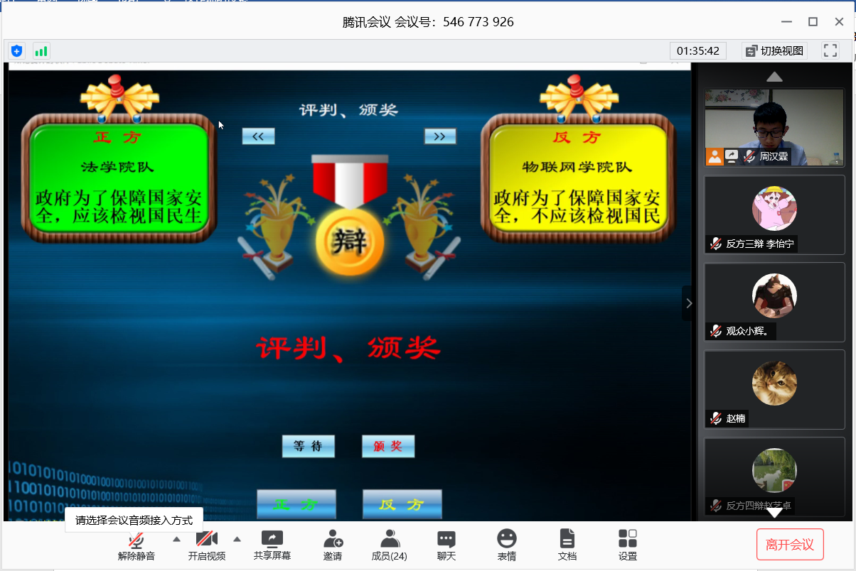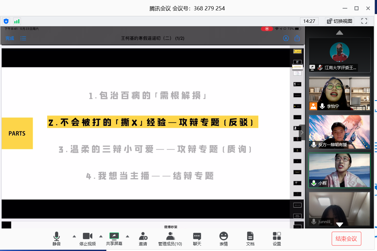 本次“江南之春”校级辩论赛从4月29号开始线上举行,共12个学院参赛,分初赛,复赛,半决赛,决赛四轮,时间持续一个月。首轮比赛物联网学院对阵设计学院,以3:0的比分赢得比赛,同时,物联网学院三辩李怡宁荣获最佳辩手,顺利晋级复赛。复赛中,物联网学院以充分的理论准备和反复的模辩,冷静自若,取得了更大的优势,以3:0的票数再下一城,最佳辩手为物联网学院二辩王瑞涵。复赛结束后,物联网学院以两轮比赛积分最高的优秀成绩跳过半决赛,直通决赛。