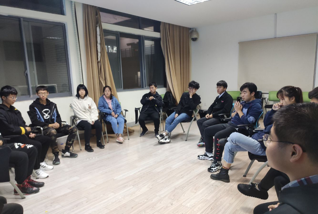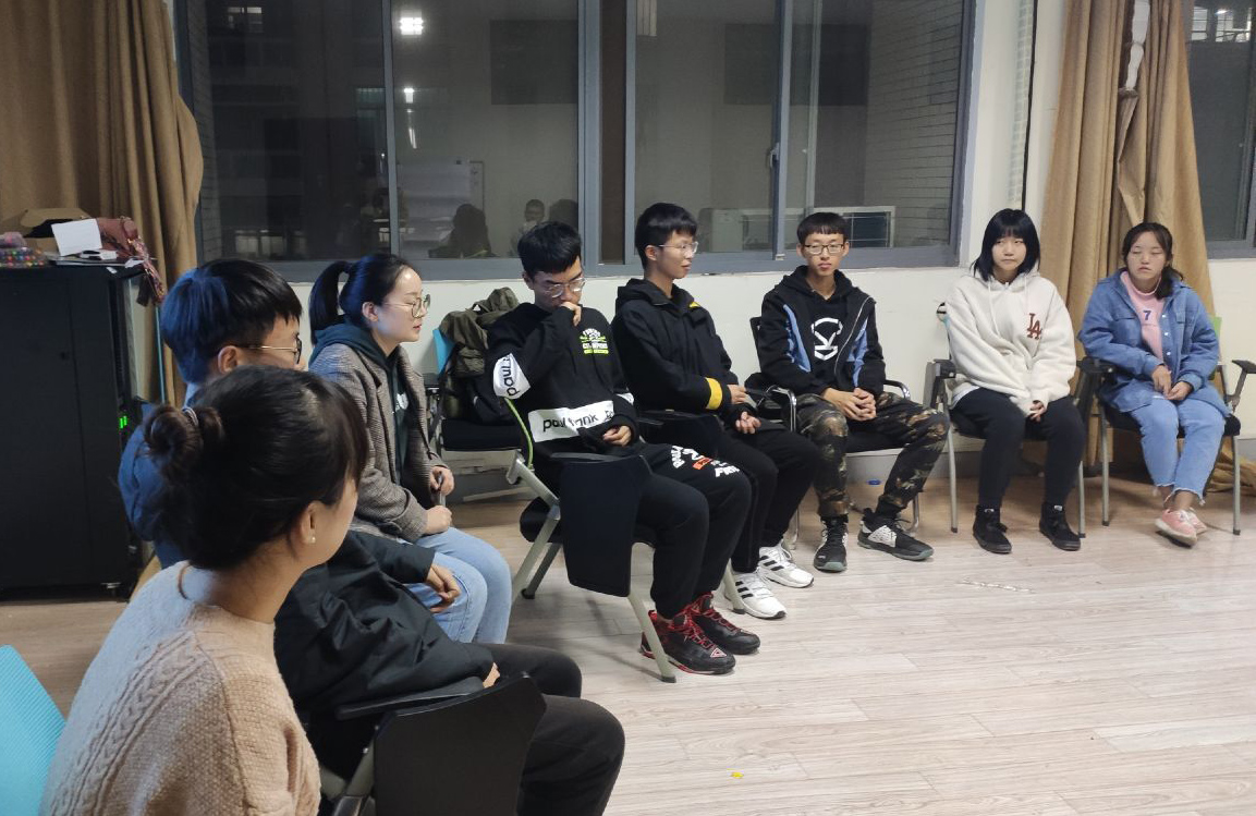 在活动开始之前,伴随着优美的音乐,童玉梅老师首先进行了自我介绍,紧接着对活动的安排、方式和意义进行逐一介绍。团辅活动以“滚雪球”的游戏开始,大家被分为两个大组,按组进行活动。每位成员要在小组内介绍自己并了解其他组员的基本信息,达到能够当众一口气说出全体组员信息的程度。在互相竞争的氛围中,各位成员高效地记下其他组员的姓名、籍贯等信息。两组都不甘示弱,在两分钟的准备时间之内都非常用心的去记忆,游戏进行地很顺利,其中一组获胜,输的一组被惩罚用破音唱歌,氛围十分融洽,团队的凝聚力逐渐增强。接下来的活动是“说出自己的故事”,每个人轮流坐在中间的位置和大家分享自己在与人交往过程中遇到过的开心事,听众以积极的态度聆听,并给予回应。这个环节在轻松愉快中度过,彼此小组成员之间更加信任,交流更加深入。整场活动在一片欢声笑语中进行。之后是“话里有划”游戏,即是“你画我猜”,由第一个人看词进行动作演绎,后面的人接力将动作传递下去,最后一个人猜词,总共4组,两两进行,所有小组相互协作配合,不断调整姿势,最后所有的组都将正确答案猜了出来。接着是以消极的态度倾听他人的分享,让大家感受与积极倾听的区别,更好地消化、处理自己的感受,同时也促进同学们理解肢体语言的含义。最后的活动是“心有千千结”,所有的成员们围成一个圆圈,并根据游戏提示,让不同手臂纵横交错形成一个结,想要解开这个结,不是件容易的事情。经过团队中各位队员思想的碰撞与融合,将集体的力量化成智慧,解开了千千结。很多困难看似无法解决,但只要换种思维方式,就可以找到出路,而在解开自己心结的同时,也了解了别人的心结,心有千千结,也有千千解。