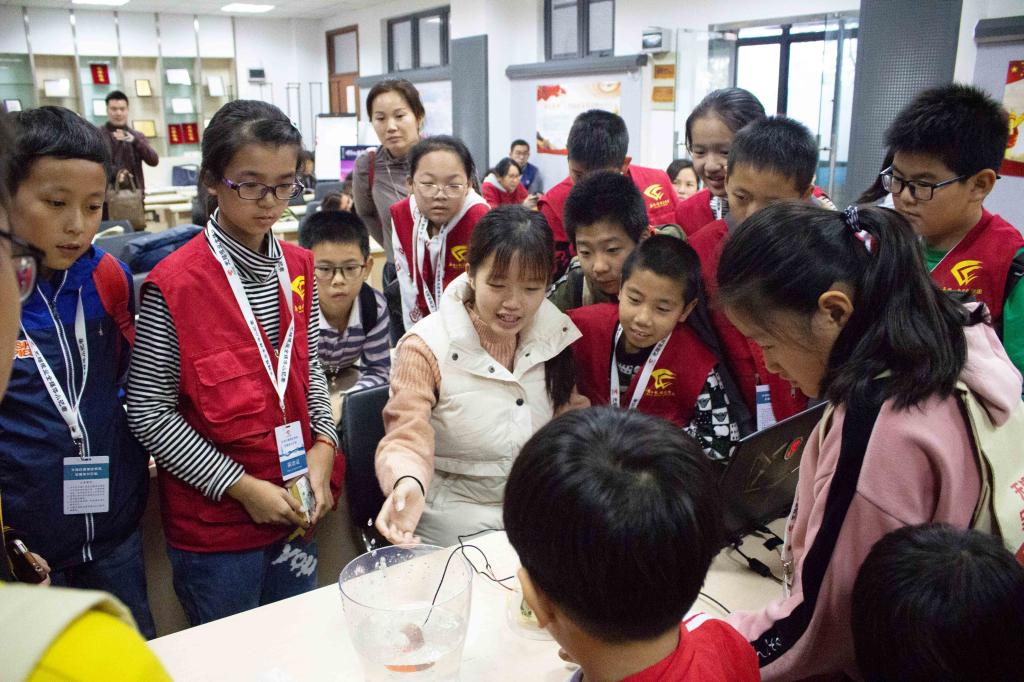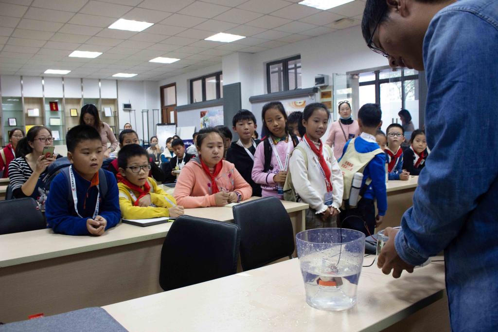 科协学生为小记者们展示“音乐喷泉”的神奇“魔法”