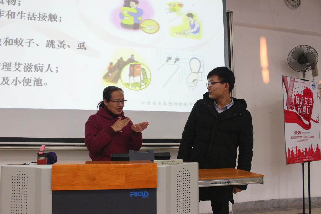 沈力晔首先邀请了一位学生代表上台进行有关“艾滋”话题的交流,以此了解学子们对“艾滋”的相关知识掌握程度。随后,她组织学子们填写线上问卷调查并播放了关于防治艾滋病的短片。她以2017年得到的统计数据为学子们解读当前“防艾”的必要性以及掌握与“艾滋”相关知识的重要性。她详细介绍了艾滋病致病原理、传播途径、感染艾滋后的发病过程、艾滋病检测方式、艾滋病的危害性、合成毒品的危害以及合成毒品对艾滋病传播助纣为虐的影响等知识与话题。其间,她与学子间的多次互动交流提升了讲座的趣味性以及学生的参与度,在互动中,她解答了学生们对于“为什么昆虫不能传播AIDS”、“为什么非洲国家的人均期望寿命会因艾滋病的传播锐减如此严重”等疑问。最后,在艾滋病预防中,她提出:健康教育是最有效的疫苗。她告诉现场的学子们,艾滋不可怕,寻求帮助最为重要,作为一名健康人,我们应当以同等的态度对待艾滋病人并给予他们关怀与帮助。