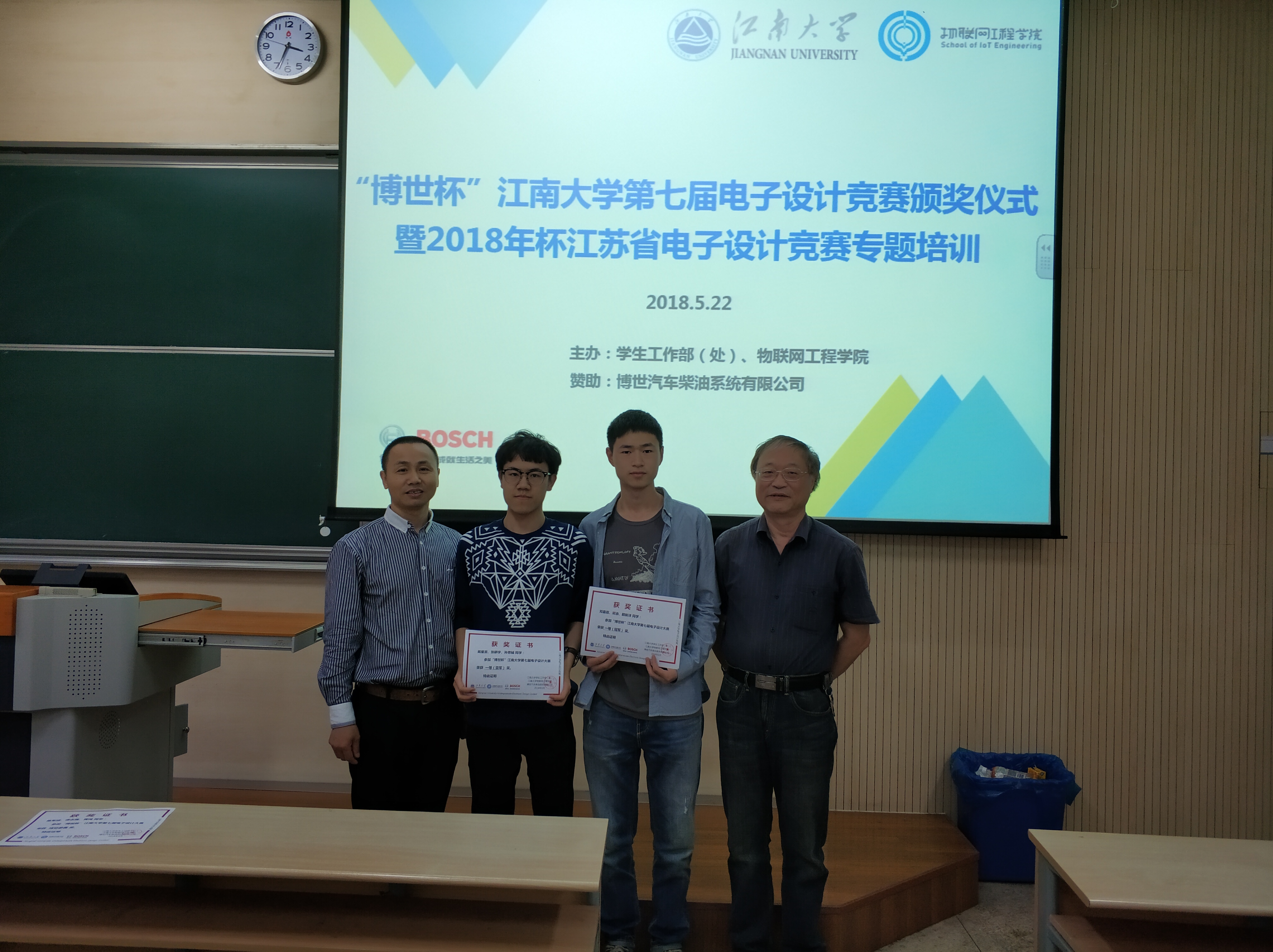 设立的“博世助奖学金及创新奖”项目资助该比赛的举办。该项竞赛作为学校D类学科竞赛,在我校已举办七届,现已成为一项品牌学科竞赛。本届竞赛共有来自不同专业的24支参赛队报名参赛,最终共有2支团队活动一等奖,6支团队获得二等奖。并通过本次竞赛,选拔优秀团队参加2018江苏省电子设计竞赛。