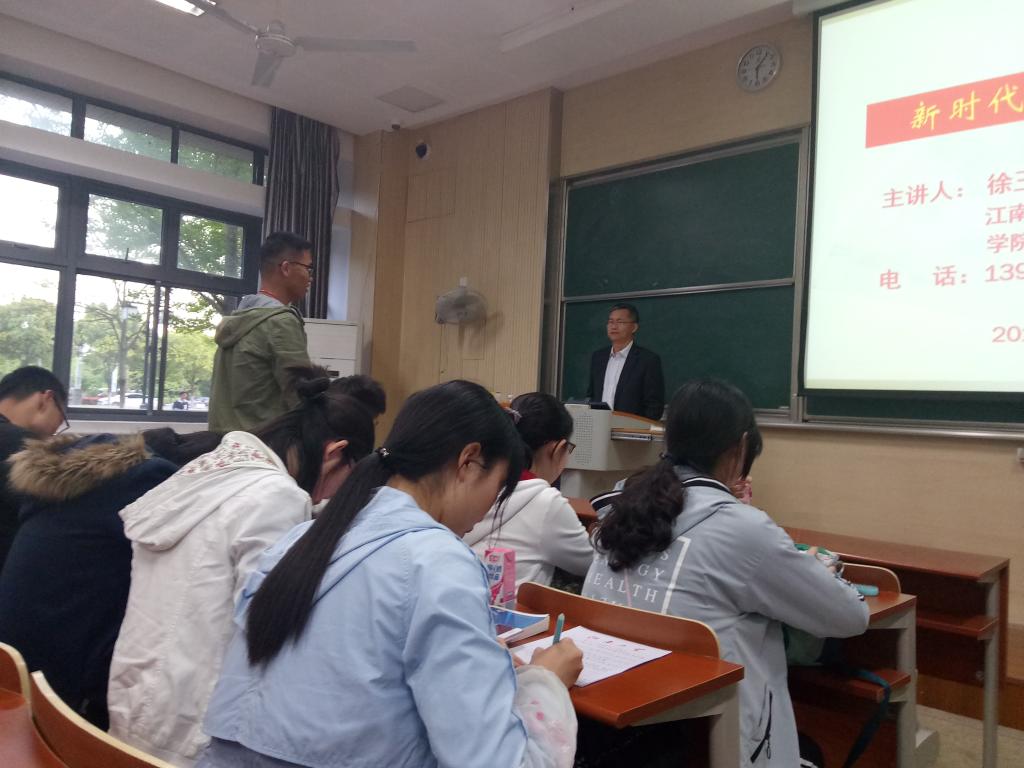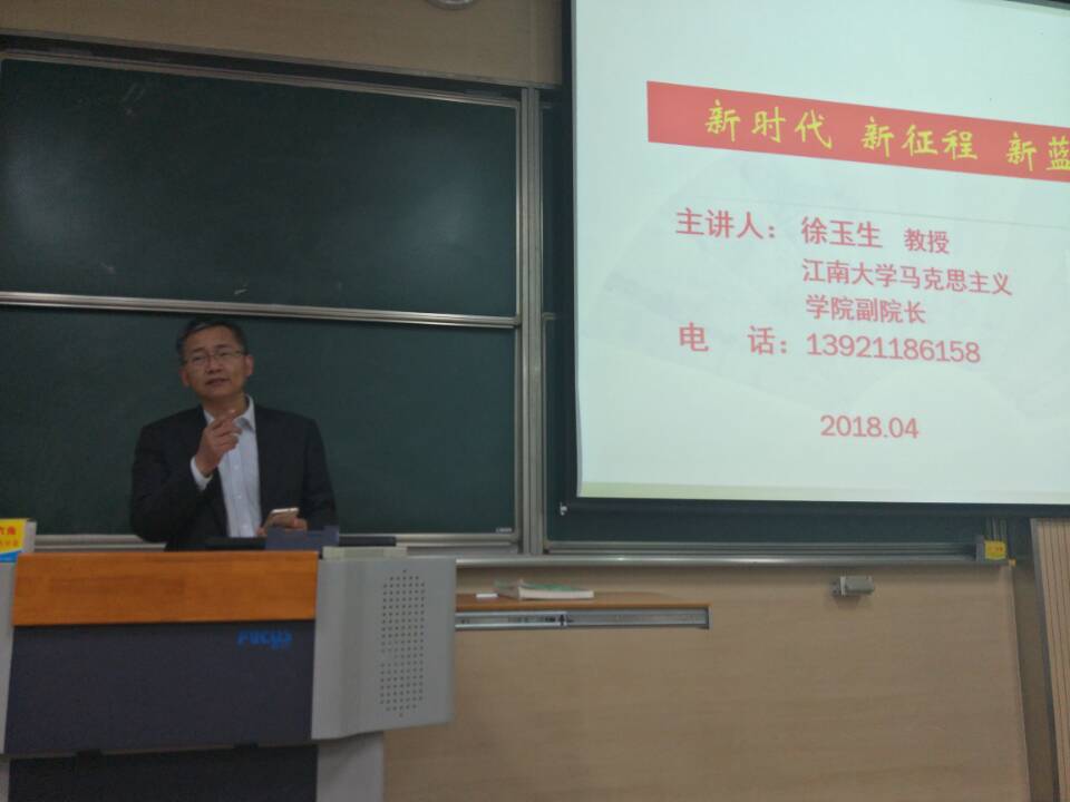首先,徐教授以对“对美国挑起的贸易战,中国采取针锋相对的反制措施”这一话题的讨论为引,开始了本次报告的第一部分:新时代。即新团队、新面貌以及新问题。关于新团队,徐教授讲到党的领导是第一位的。所谓“武能安邦,文能治国”,如今,国家的顶层设计迈出了新的一步,建立了中国特色权力制约和监察机制,同时指出领导核心的重要性,强调坚持党内原则——民主集中制,确定以人民为中心的服务思想,重视民生,反对独裁与多数人暴政。关于新面貌,徐教授用满怀自豪感的声音,将中国成功研制天宫、蛟龙、天眼、悟空、墨子、大飞机等大国重器,以及岛礁建设等众多举世瞩目的成就娓娓道来。在提及天宫和蛟龙时,徐教授引用了毛主席的一首诗:上可九天揽月,下可五洋捉鳖。关于新问题,徐教授说“我国社会主要矛盾已经转化为人民日益增长的美好生活需要和不平衡不充分发展之间的矛盾”,而这也中国人民收入分配的两极分化和人口老龄化带来的挑战。