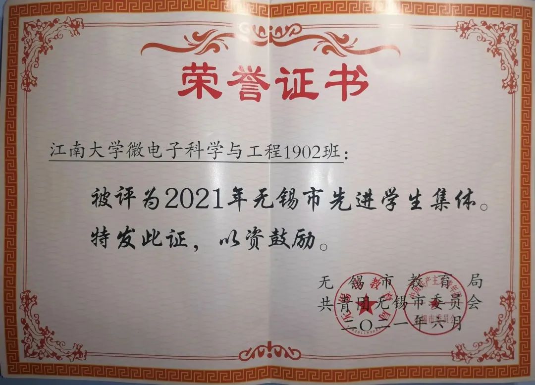所在班级获得“无锡市先进班集体”
