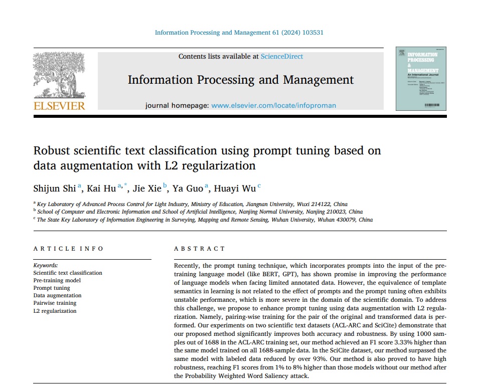 2020级本科生时世骏以第一作者身份在《Information Processing & Management(IP&M)》(中科院一区,IF=8.6)发表题为“Robust scientific text classification using prompt tuning based on data augmentation with L2 regularization”的学术论文,该期刊是Elsevier出版社旗下信息科学领域的权威期刊之一。中文无码