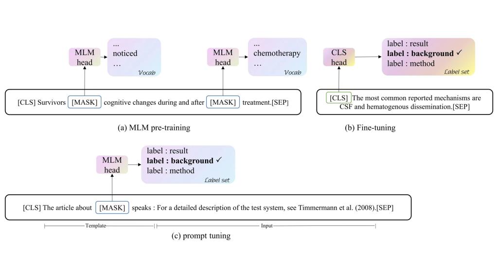 掩码语言模型(MLM)预训练(a)、BERT模型的微调(b)和提示学习方法(c)