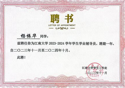 杨振华还担任党务中心成员,负责整理各党支部档案,并审核核对格式和内容等问题。并积极参与志愿服务工作,如党员大会现场布置活动、学院招聘大会现场管理等;他还聘任学业辅导员一职,为有挂科或学业预警的同学辅导专业核心课程,答疑解惑,巩固所学知识。通过整理错题笔记和制作思维导图的独特方式,对那些同学进行帮扶指导。经过一学年的学业辅导,其中一名顾同学的学年GPA从2.4提升到3.27,有显著的进步。
