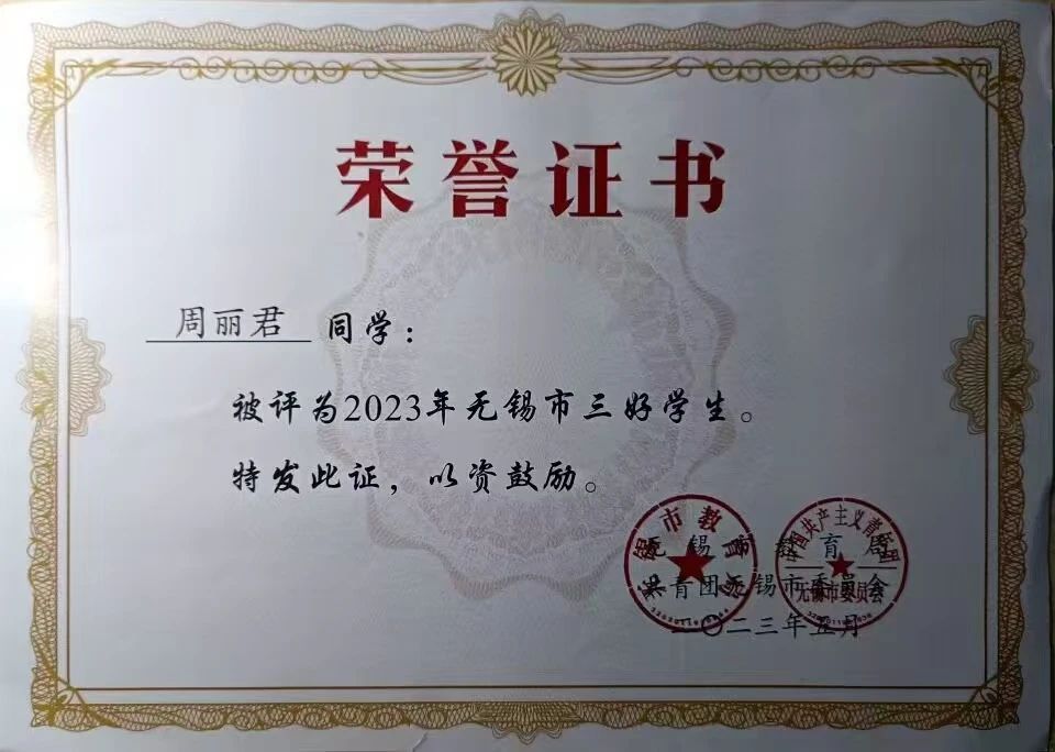 荣获2023年无锡市“三好学生”