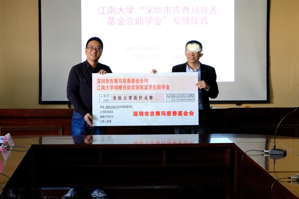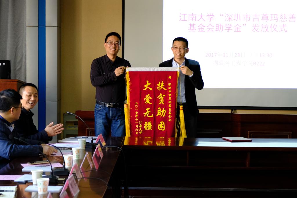 捐赠助学金,社会资源处黄敏处长向深圳市吉尊玛慈善基金会赠送锦旗,仪式在嘉宾与同学们的合影中圆满结束。同学们脸上洋溢着喜悦与感激的笑容。