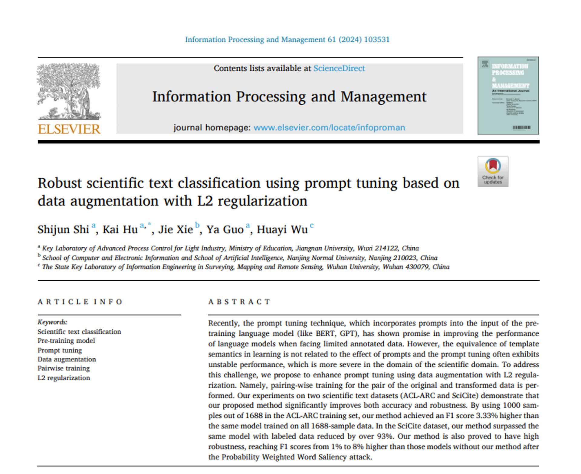 2020级本科生时世骏以第一作者身份在《信息处理与管理》(中科院一区,IF=8.6)发表题为“使用基于数据增强和L2正则化的提示学习进行鲁棒的科学文本分类”的学术论文,,该期刊是Elsevier出版社旗下信息科学领域的权威期刊之一。中文无码